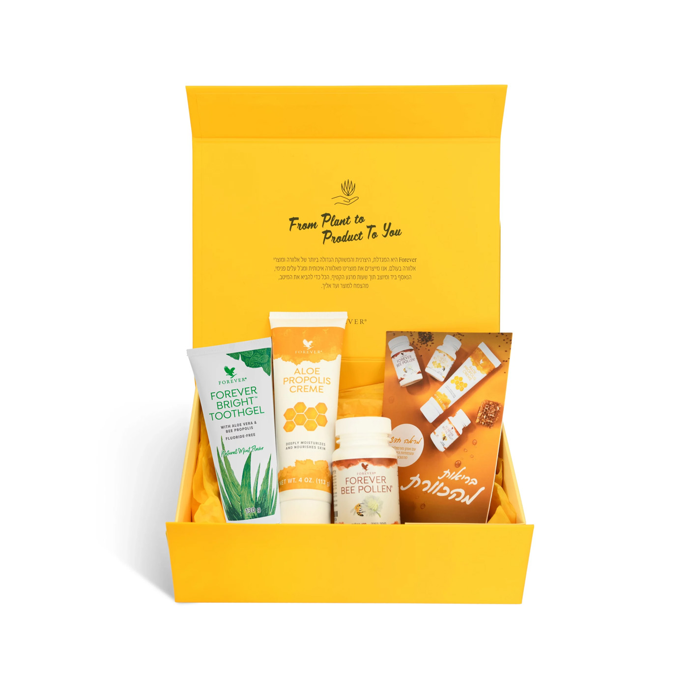 מק"ט: 792מארז מתנה ייחודי המשלב את עוצמת הכוורת והאלוורה. הערכה כוללת קרם פרופוליס להזנת העור, ג'ל צחצוח טבעי לשיניים וטבליות בי פולן להגברת האנרגיה והחיוניות.